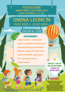 Zapisy na półkolonie odbywają się w siedzibie Urzędu Gminy Leoncin, ul. Partyzantów 3, 05-155 Leoncin od 05.06.2025 r. od godz. 10:00 do 12.06.2025 r.